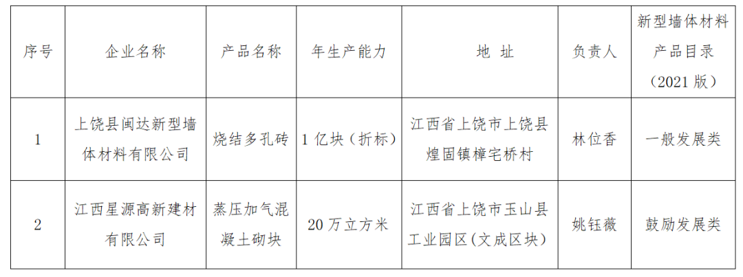 根据《江西省新型墙体材料产品认定管理办法》和《关于进一步做好新型墙体材料产品认定与预拌混凝土和预拌砂浆生产企业及产品目录申报工作的通知》,经企业自愿申报、各地新型墙体材料主管部门审核及江西省工业和信息化厅复核汇总,拟对上饶县敏达新型墙体材料有限公司等2家企业生产的新型墙体材料产品进行认定。现将拟认定名单予以公示。欢迎社会各界参与监督,如有异议,请与省工业和信息化厅建材工业处联系。