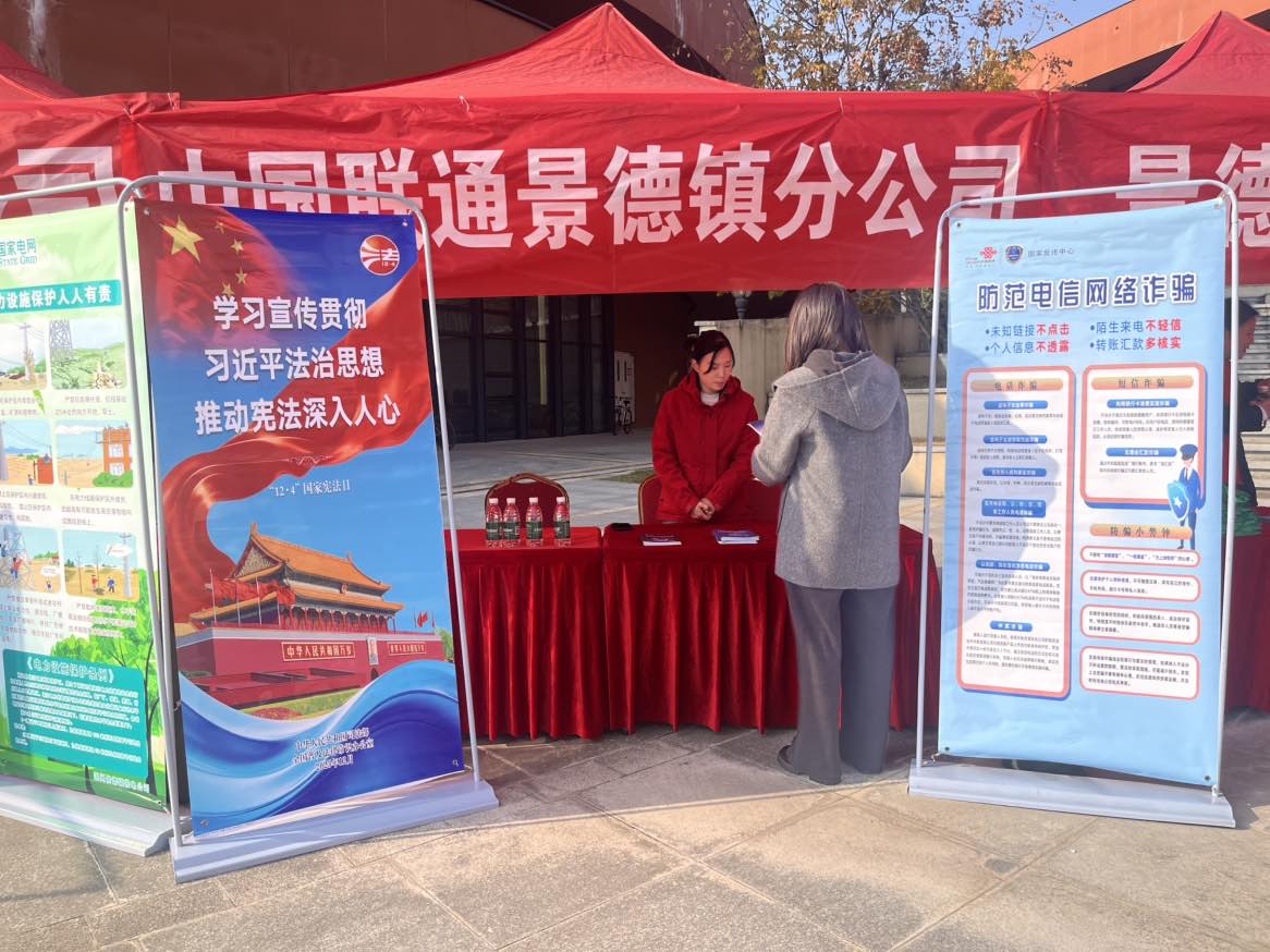 12月4日国家宪法日,由市委依法治市办、市委宣传部、市司法局联合主办的“宪法宣传周”活动在江西陶瓷工艺美术职业技术学院火热开展,景德镇联通联合市工信局,聚焦学生群体网络安全与诈骗防范高频高发痛点,把反诈课堂搬进高效校园,为师生送上了一场生动、实用且贴近生活的普法宣传活动。